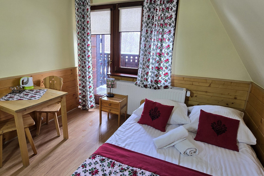 Dwuosobowe pokoje z łazienką z kabiną prysznicową lub wanną, suszarką, ręcznikami oraz galanterią hotelową. Wyposażone między innymi w płaski telewizor oraz stół i drewniane krzesła. Urządzone z nutą góralskiego akcentu. Część pokoi z balonem.